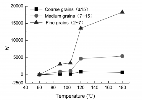 (2) The number of coarse, medium and fine grains changes regularly with the heating temperature. The number of medium and fine grains grows, while that of coarse grains increases firstly and then decreases with the rise of heating temperature. From 60°C to 120°C, the number of coarse grains increases continuously and the number of coarse grains at 120°C is more than 3 times than that at 105°C, indicating that the fragmentation becomes more obvious after the temperature surpasses 120°C. However, the number of coarse grains falls back at 180°C, down by 202 from that at 120°C, while the number of medium and fine grains is higher at 180°C. Therefore, the fragmentation degree is positively correlated with the temperature.