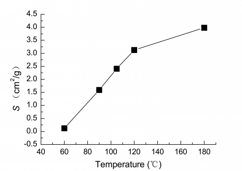 (2) The specific surface area of the samples increases with the temperature. The growth rate is high between 60°C and 120°C but slows down from 120°C to 180°C. The results show that a sample would break down completely at a certain temperature if the dimension and mass remain constant, and its specific surface area tends to a certain value.