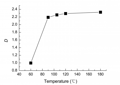 (2) The fractal dimension increases with the increase of temperature. At the heating temperature of 60°C, the sample remains intact and the fractal dimension reaches the minimum. From 60°C to 90°C, the fractal dimension increases rapidly, but the growth rate slows down after 90°C. Thus, the fragmentation degree increases with the increase of temperature; when the heating temperature surpasses a certain level, however, the fractal dimension of the sample may reach a stable state.