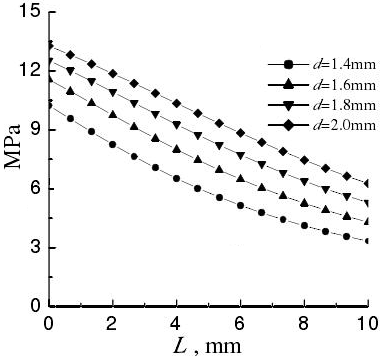 Figure 11 shows the relationship between nozzle outlet diameter and the axial pressure distribution at different distances from the axis. As can be seen from the figure, the axial pressure dropped as the water jet moved away from the axis for all nozzle outlet diameters. At the same distance from the axis, the axial pressure was almost linearly increasing with the growth in the outlet diameter.