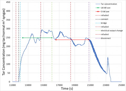 Tar concentration in gasification systems changes rapidly and sometimes unpredictably. Tar testing with standard methods have no ability to capture fluctuations in tar concentration. However, the OLTT apparatus used in the present work effectively captures fluctuations in tar concentration. Dynamic effects of events and changes in testing parameters such as altering the electrical output, refueling, testing location, and reactor architecture are now visible and can be understood in greater detail. Several conclusions may be drawn from the present work: