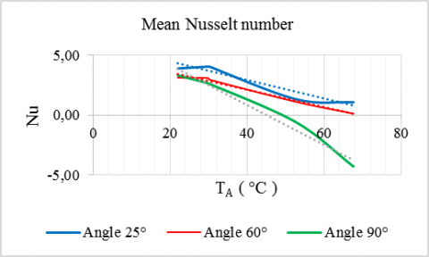 The variation of ''Nu'' as a function of lateral heating and inclination in the convective regime are displayed underneath for few experimental conditions. It can be seen that the number of "Nu" is different from the classical case of convection flows influenced by physical and geometric parameters (as our study case) as fluid behaviour in the cavities. In this study, the Nusselt number is presented by the average code Fluent (ANSYS) and plotted by the software Origin 8. These graphs present the effect of the both parameters on the convection flow.