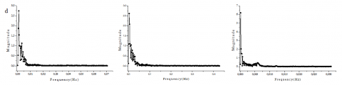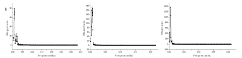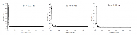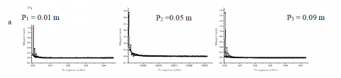 For the angle 25° Fig. 13, a, b, c and d); the fluctuations have an importance close to the active side wall therefore at point P1 = 0.01 m and the amplitude becomes small away from this point whatever the value of TA. While these fluctuations are concentrated and have a small amplitude without lateral heating for the angle q = 60° except the third point (Fig. 14, a), contains two important amplitudes. The application of the lateral heater effect on their concentration as well as their amplitude at all point (Fig. 14, b, c and d). Lateral heat is directly proportional to the amplitude of the fluctuation and inversely proportional to the concentration of their presence. Fig. 15, (a, b, c and d) illustrate that: as the angle q = 60° without lateral heating the angle q = 90° for TA = 0°C in the three points have the same configuration but with higher Magnitude. These fluctuations crushed at the beginning of the lateral heating for the low temperature but it shows again for the higher values.