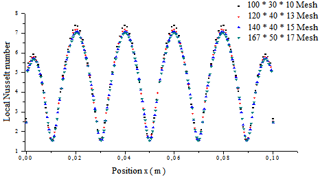 The simulations complement the experimental results, providing the thermal and dynamic maps of the fluid for the convective heat transfer. The preceding system of equations is resolved by the finite volume method described by Patankar [23] where the geometrical configuration is discretized by means of a structured grid of cells uniformly distributed in the domain. A uniform grid distribution in the three directions were generated for flow and thermal computations. The results were checked for grid independence (Figure. 2) and grid size change from 100 x 30 x 10 to 168 x 50 x 17 according to aspect ratio of the enclosure which has been created using Gambit 2.2.30 code.