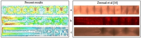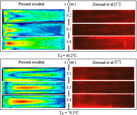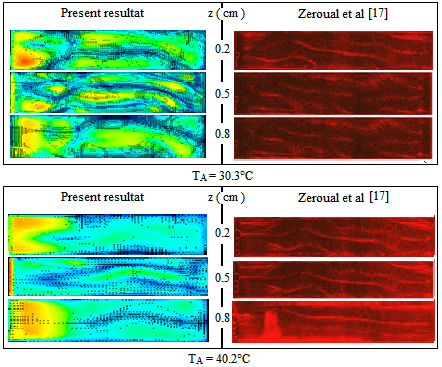 Figure 3, b and c: compare the numerical results obtained with the experimental ones, for various imposed temperatures in the left sidewall called lateral heating. The presence of the horizontal temperature gradient changes the pattern structurs as well shown in the two last (b and c). We noted two types of rolls; rolls with small sizes appear in odd number called Bénard rolls and a large one named the induced roll caused by the imposed temperature TA this last compress the others. For this case also, we can say that our resolution of the problem gave good results. It should also be noted that the influence of each gradient remains limited to a distinct portion of the total cavity, so the horizontal temperature gradient destabilized the classical convection and its influence is present by the induced roll, the distance of this last increases with the increasing of the side temperature. The simulation processes and experimental are agreement.