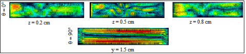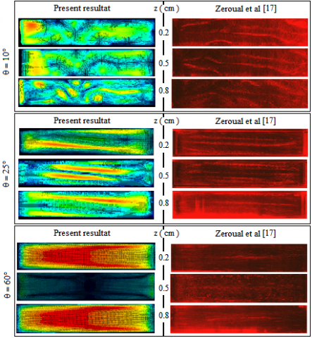 The lateral heating doesn’t applied for all angles. In this case, the convection is managed by the vertical temperature gradient caused by heating the bottom and cooling the top. Figures 4 (a, b, and c) compare numerical and experimental results for velocity maps in an inclined cavity for the angles 10°, 25° and 60° in three differents (xy) plane. The results present the effect of tilt angle on the fluid behaviour; it is clear from those results that there is a total disturbance at the transverse Rayleigh-Bénard rolls shown by 10 tubes perpendicular to the vertical temperature gradient and replace them with one, two or three longitudinal rolls.