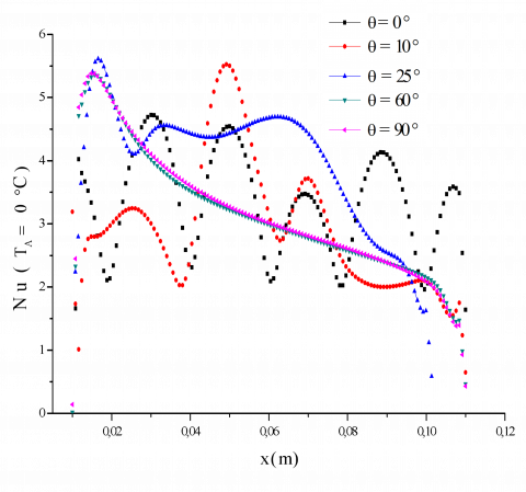 Figure 9 shows the evolution of the local Nusselt number along the bottom wall for angles 0°; 10°; 25°; 60° and 90°. At first, for q = 0° with TA varies (Figure 9 a), it can be seen that the local Nusselt number has temporal oscillation (TA = 0°C). The distribution of local Nusselt number has lost its nearly regular periodic property near the lateral heating wall (TA > 0°C) [18].