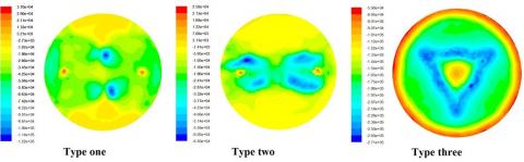 Figure 7 describes the static pressure distribution along the axial direction of the central passage. It can be seen that type three had a much lower static pressure than the other types. The valley of the static pressure of this type of nozzle appeared at about -0.275m, near the outlets of the nozzle. Type one had a slightly better performance than type two.