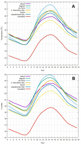 Temperature and relative humidity data with a temporal resolution of 10 minutes were collected from seven meteorological stations distributed in strategic points of the urban area of Naples for the year 2016. One additional meteorological station located in S. Elmo provided data with a daily resolution.