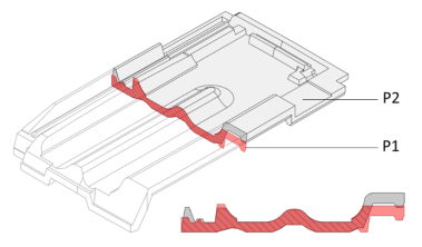 Two novel tile shapes are analysed and compared. Figure 2 shows the 3D model and the cross section of the improved shape project P2 (in grey), which is compared with the cross section of the basic project P1 (in red). The P2 improved design involves changes in the side-lock geometry, which is higher than in P1, to facilitate air intake when wind blows sideways. As a consequence, the labyrinthine path formed by the gap between tiles (i.e. the side-lock pattern) has been modified to yield the driving rain function.