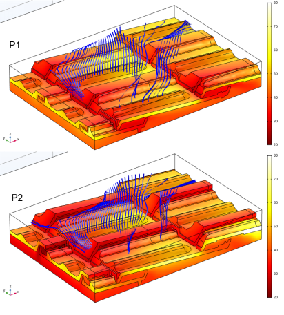 Figure 6 depicts the temperature distribution on the tile sections with P1 and P2 shapes. In addition, the fluid flow stream lines near the tile upper surface are shown when the air blows sideways over the tiles (β = 60°; i = 1 m/s), which represents a favourable condition for P2. Overall, the P2 tiles are slightly cooler than the P1, especially in the portions where the geometry has been modified. The sidelock in P2 is higher to have a larger opening exposed to the air flow when coming from the side, thus allowing more air to flow through the tiles.