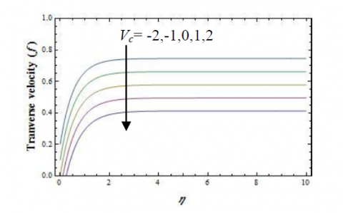 where, ${{V}_{c}}={}^{{{v}_{c}}}/{}_{\sqrt{\alpha \nu }}$ represents the suction/injection parameter(mass transpiration) and three cases arises depending on the choice of ${{V}_{c}},$ namely suction, impermeable and injection when ${{V}_{c}}>0$ , ${{V}_{c}}=0$ and ${{V}_{c}}<0$ respectively.