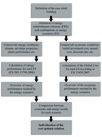 Often, in a new construction or retrofit intervention, the minimum legislative standards are respected with the lowest cost, without the evaluation of the life cycle cost of the building and its components [9]. Lo Cascio et al. [10] adopt a building retrofit prioritization process to define the most cost-effective intervention for a 7000 m2 residential Australian building; this approach assesses economically each Energy Conservation Measure, giving priority on the basis of the performance achieved in connection with economical indexes (Net Present Value, Internal Rate of Return, Profitability Index, Discounted Payback Period). Another procedure followed by many scientific authors is the cost-optimal methodology, consisting in the energy and economical assessment of energy refurbishment packages composed by several different measures combined together; this method follows the European Guidelines n.244/2012 [11].