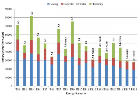 The combination of the different energy refurbishment solutions thought for the envelope and the thermal plants brought to the formulation of 18 Energy Scenarios (ES, Table 4) to be assessed. In each scenario, radiant panels were chosen as emission system, since the operating temperature is low (30-35°C) and it is the optimal terminal device to be associated with heat pumps.