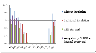 Figure 9. Monthly percentage trend of heating load depending on the insulation type used, compared to the total heating needs