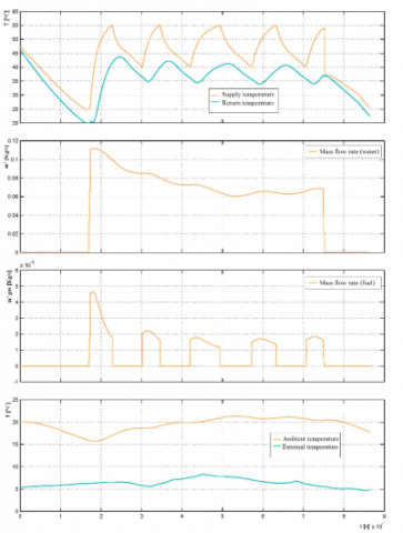 The obtained results (Fig. 7-14) show the time history of supply and return temperature, water (regulated by thermostatic valves) and fuel mass flow rates, ambient internal temperature of the building and external temperature. When the supply temperature reaches 55 °C a “relay” command disables the boiler until the temperature drops below 40 °C, moment in which the boiler is reactivated. The fluid flow is regulated by thermostatic valves on each radiator allowing the passage of a predefined amount of fluid in function of the temperature that is established within the building. This allows to avoid the overheating of the building and the consequent unnecessary energy waste. In the end, boiler and pump are switched off and all the temperature curves show a decreasing trend.