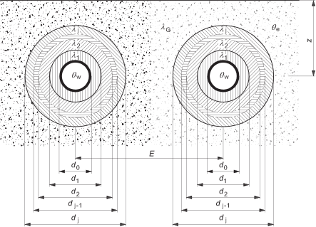 where n is the number of insulation layers, dj the external diameter of insulation layer j starting from the inner one [m], d0 the external diameter of the pipe, dn the whole external diameter of the insulated pipe, kj the conductivity of the insulation layer j, kG the conductivity of the masonry (assumed equal to 0.7 if there is not any available information), z is the installation depth (assumed equal to 0.1 if no information is available) and E is the center distance of the pipes as reported in Fig. 2.