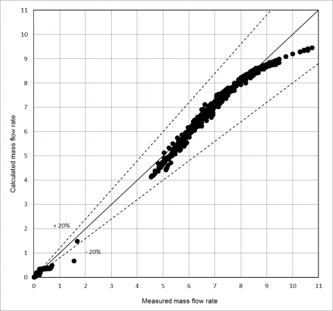 Figures 3-5 show the comparison between measured and predicted temperature values for supply temperature, return temperature and mass flow rate; the dotted lines indicate a difference between predicted and experimental values of ±20%. The absolute mean error resulted equal to 4.8°C for supply temperature and 4.6°C for return temperature.