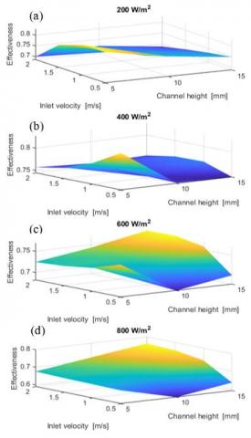 Figure 11. Effectiveness of the humidifying chamber at different heat fluxes as a function of inlet velocity and channel height for winter conditions; heat flux of 200 W/m2, 400 W/m2, 600 W/m2 and 800 W/m2