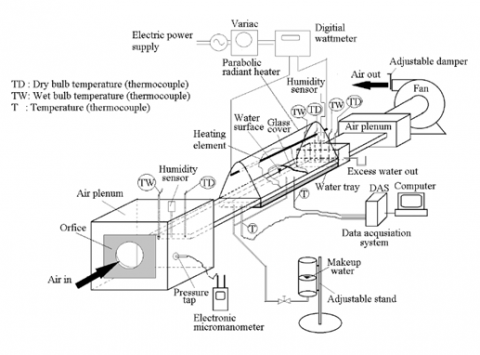 Figure 2-(a) shows a cross-section of the test section and Figure 2-(b) shows the experimental setup of the test section with the parabolic radiant heater unfolded. The test section (the plate type humidification chamber) consists of the glass cover with a 3 mm in thickness on the top surface and is heated uniformly by a parabolic radiant heater. Other sidewalls were made of acrylic plates and insulated with foam. Moreover, the bottom surface was attached to liquid water tray and insulated with silicon layers. The dimensions of the water tray are 960 mm in length, 200 mm in width, and 3 mm in depth. The water level was fixed to be 3 mm in the water tray. The gap between the upper surface and the free surface of the water layer was maintained at 3 mm. The water level during the experiments was controlled manually using the adjustable stand with a makeup water reservoir.