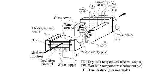 where $A_{surface}$ is the area of the top surface of the glass cover. The effectiveness of the humidifying chamber is calculated according to the following equation: