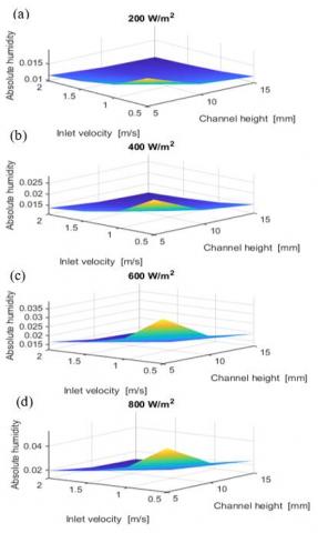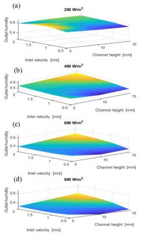 The highest evaporation rate was achieved for the narrowest channel and lowest flow rate, i.e., 5 mm and 0.5 m/s. The behavior of the outlet relative humidity followed a saddle surface at high heat fluxes, i.e., 400 to 800 W/m2. The maximum ${{\phi }_{out}}$ is achieved at either low U and narrow ha or large U and large ha . The effectiveness of the humidifying chamber strongly depends on the inlet conditions. At lower heat fluxes, i.e., 200 to 400 W/m2, the maximum ε was achieved at the smallest ha and U, while for higher heat fluxes, maximum ε corresponded to largest ha and U.