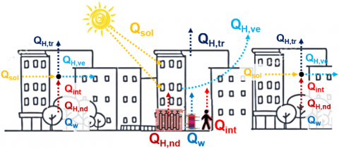 The total heat transfer (QH,ht) is composed of the sum of the heat transfer due to transmission and ventilation; the total heat gains (Qgn) is due to internal heat sources and solar components.