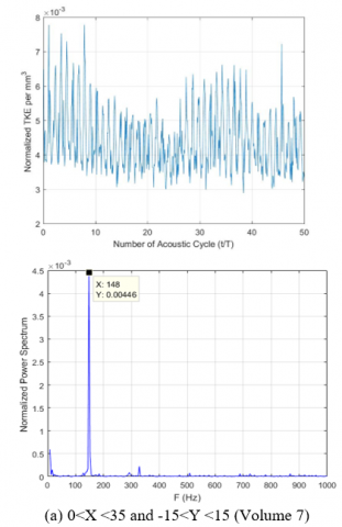 In order to plot the temporal change of the TKE obtained from the different volumes, the sum of $\frac{T K E}{U_{0}^{2}}$ over each volume was divided by the volume in which the TKE was calculated. By performing this calculation for successive TomographicPIV images, we obtained the normalized TKE per unit of volume as a function of time. The time was normalized by the period of self-sustained tones of the acoustic signal obtained for this Reynolds number, where $T=\frac{1}{f} \approx 6$ ms for $R e=$ $5435 .$ In this way, the volumetric normalized TKE per unit of volume was obtained as function of the acoustic period of the self-sustained tones.