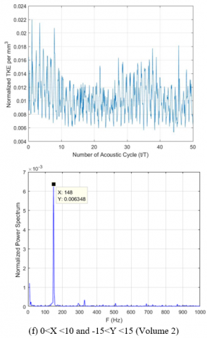 In Figure 4 we plotted the temporal evolution of $\frac{T K E}{U_{0}^{2} * \text {Volume}}$ eand its spectrum extracted from different sub-volumes of the flow as illustrated in Figure $3 .$ One can see that the temporal esignal of normalized TKE have higher amplitudes as the volume of interest become smaller. For example in Figure $4 . a$ (volume 7 which is the bigger one), the amplitude of normalized TKE reach a maximum of about $7.9 * 10^{-3}$ per $\mathrm{mm}^{3}$ when it reaches a maximum of about $4.25 * 10^{-2}$ per $\mathrm{mm}^{3}$ for volume 1 (the smaller volume). Actually, by excluding zones of low turbulent activity far from the wall of impact the relative TKE per unit of volume become higher and higher for high turbulent zones. One can also see in Figure 4 that the power spectra of $\frac{T K E}{U_{0}^{2} * \text {Volume}}$ for all volumes (volume 1 to $7 ;$ Figure 4 ) have the same main peak of frequency $\left(F_{0}=148 \mathrm{Hz}\right) .$ In Figure $4 . \mathrm{g},$ where volume 1 was considered (very close form the surface of impact), there was a harmonic frequency in the power spectrum due to the interaction with the slotted plate: $F_{1}=2 * F_{0}=296 \mathrm{Hz}$.