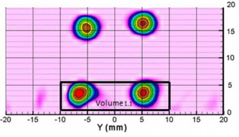In order to identify volumes of high $\mathrm{TKE},$ the velocity measured in the volume extended from $X=0$ to $X=40 \mathrm{mm}$ from $\quad Y=-15 \mathrm{mm} \quad$ to $\quad Y=15 \mathrm{mm} \quad$ and $\quad$ from $\quad Z=-5 m m$ to $Z=5 m m$ were divided into seven sub-volumes, shown in Figure $3 .$ The dimensions in the Y-direction $(-15 m m<Y<15 m m)$ were chosen in such a way that they contained vortice deformation zones in which the acoustic source is created in the impact region.