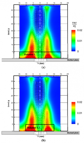 One could suggest a volume of the jet (similar to volume 1.1 illustrated on Figure 6) that have a height of $0.5 * H$ and a length of $2 * H$ in order to analyze the evolution of the TKE in case of a rectangular jet impinging on a slotted plate.