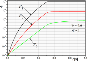 Figure 12. The growth kinetics of the Arrhenius damage integral $\Psi$ at selected control volumes of tissue domain (see: Figure 3) for theating = 0.5 s (Case 2)