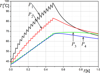 In the first simulation, the additional parameters have been assumed: U1 – U2 = 120 V, tperiod = 0.025 s, tpulse = 0.005 s, theating = 0.5 s, tsimul = 1 s. Here, the duration of the current pulses corresponds to a 20% duty cycle.