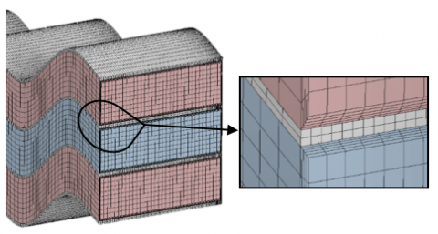 Following an hexahedral mesh was created and refined. The mean velocity of the nanofluid at the heat exchanger’s outlet was used as the mesh convergence parameter. The mesh was considered fine enough for residual errors of around 10-4 and when the physical stabilization was achieved. An even more refined mesh was generated for representing the plates and a Boundary Layer was used to represent the contact between the fluid and the plate. Figure 2 shows the geometry with the hexahedral mesh formed by approximately 400 thousand elements. The skewness of the mesh, which represents the deviation of the vector that connects the center of the neighbor volumes to the center of the face, was approximately 0.35, and the maximum value below 0.90, which made the mesh very suitable for the CFD study.