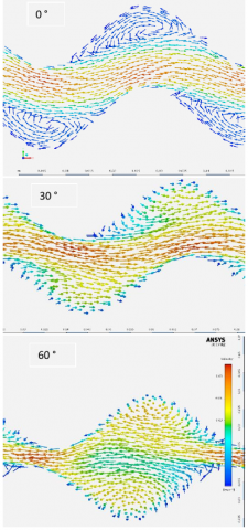 The velocity profiles in Figure 9 shows that when there is no angle between the plates, there is a greater formation of reflux regions than with angles of 30° and 60°. Figure 10 also reveals that the angles allow a longer retention of the fluid in the PHE. The streamlines show the tortuous path run by the fluid to the channel’s outlet.