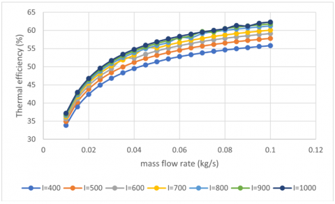 Figure 4. Thermal efficiency versus mass flow rate