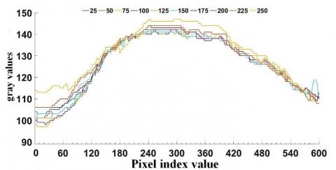 The Figure 11(a) with the largest proportion of pesticide solution was obtained through algorithm analysis. The figure was at frame 15, that is, the figure was obtained when it took 0.015s for the pesticide to enter the mixer until it was evenly mixed. According to the preliminary experiment, the G channel of the collected image was selected for analysis. After the denoising and background removal of images, the region of interest was divided into pixels, and according to the experimental method, the pixels in the axial and radial directions were divided into ten equal parts, and the gray value of each area is drawn as Figure 11(c).
