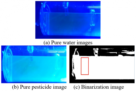 The variable mixing ratio experiment was performed after the pure agent mixing experiment of mixer. When the water flow was 140 L/min and the pesticide pressure was 1 MPa, the pesticide solution ratio was controlled in the range of 1:300 to 1:3000. After that the images of the pesticide entering the mixer were collected respectively. The results of image analysis and processing indicate that the designed online mixing system shows excellent medicine mixing performance in qualitative analysis.