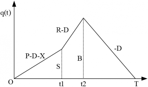 $\frac{d q(t)}{d t}= \begin{cases}P-X-D & 0 \leq t \leq t_1 \\ R-D & t_1 \leq t \leq t_2 \\ -D & t_2 \leq t \leq T\end{cases}$ (10)