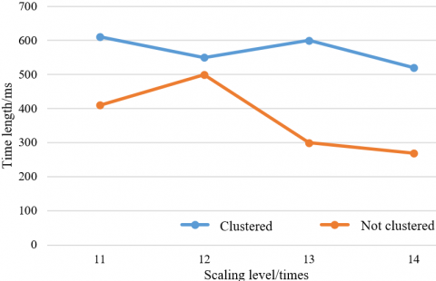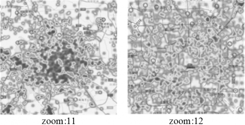 To examine the rendering efficiency of thermal maps based on clustered data, in this study, visual test was performed on clustered data with scale levels of 11, 12, 13, and 14, respectively, and the results are shown in Figure 4.