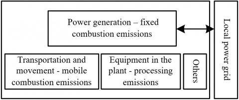 The experimental platform took lignite as fuel and was equipped with two 350,000 kw tower-type lignite boiler generator units. Because the example power enterprise is directly connected to the local power grid, there is no energy input in the form of steam or heat, so it’s determined that for this power enterprise, the carbide within the plant area has been taken as the boundary. The GHGs of the power enterprise coming from fixed combustion emissions, mobile combustion emissions, processing emissions, and escaped emission sources were identified one by one, and the diagram of boundary identification is shown in Figure 6.