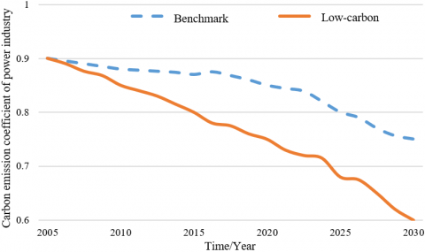 The carbon emission coefficient of the power industry is shown in Figure 9. Before 2030, the carbon emission coefficient of the power industry will decrease year by year. The emission coefficient under the benchmark scenario is greater than that under the low-carbon scenario, and the difference in the emission coefficient will become larger with the passing of time. At the same time, by 2030, the carbon emission of power industry under low-carbon scenario is expected to be reduced by about 100 million tons compared to that under the benchmark scenario. Under the benchmark scenario, the carbon emission coefficient of the power industry is expected to drop from 0.90 kg/kwh in 2005 to 0.75 kg/kwh in 2030. Under the low-carbon scenario, the carbon emission coefficient of the power industry which exhibits as wave lines is expected to drop from 0.90kg/kwh in 2005 to 0.60 kg/kwh in 2030. The experimental results showed that with the optimization of the power supply structure and the investment in science and technology, the energy utilization rate of the power industry will be improved and the goals of energy conservation, emission reduction, and peak carbon emissions will be realized. After 2030, the carbon emissions of the power industry will continue to decrease, causing the emission coefficient to decline with it.
