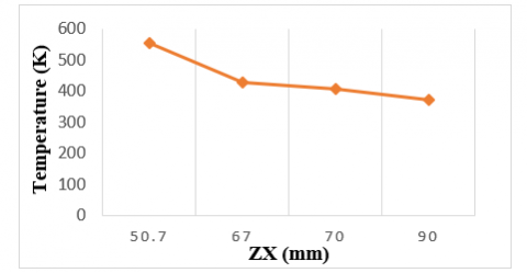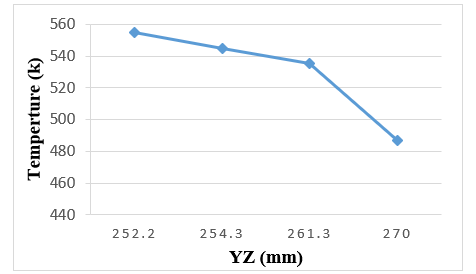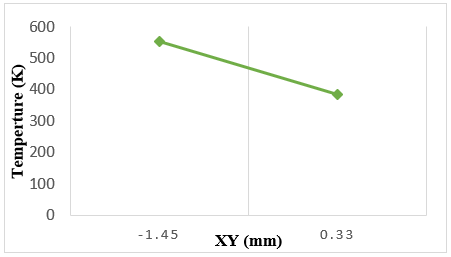 Likewise, it seen this distribution of temperature inside the tool on planes ZX and XY. It proved the temperature is gradually decreases keep away from the heat source. Figures 9 and 10 show graphically the temperature gradient inside the cutting tool on ZX and XY planes.