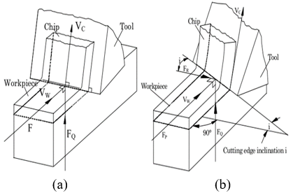 Figure 1. Types of cutting: (a) Orthogonal cutting, (b) Oblique cutting [2]