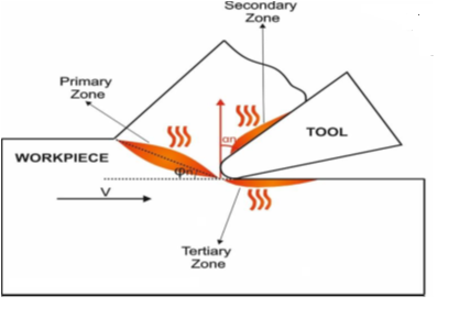 Figure 2. Heat generation zones in metal cutting [3]