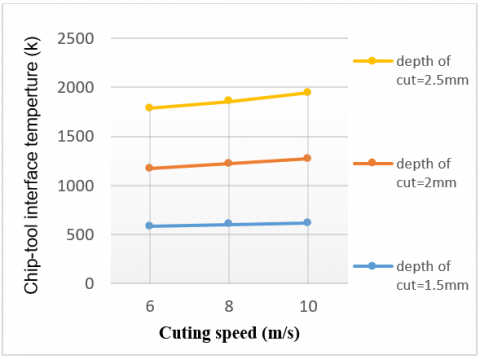 Figure 7 show the change of the cutting temperature obtained in cutting zone as the function of depth of cut with respect to different cutting speed. It can be seen in Figure 7. For the depth of cut 1.5 mm, the recorded temperature is 446.16 k when the depth of cut increases to 2 mm the value of temperature becomes 468.32 k. And when the depth of cut increases to 2.5 mm, the value of temperature becomes 522.57 k. So if the depth of cut increases, the section of chip increases and friction of chip-tool increases what leads to an increase in temperature.