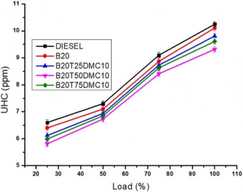 UHC emissions trend with respect to various loads is depicted in Figure 10. Incomplete combustion results increase in UHC emissions. Reduction in UHC emissions by 9.07% at maximum load for B20T50DMC10 blend than diesel fuel. The reduction in UHC emissions is owing to the higher surface to volume ratio of nano additives, higher oxygen content in the blend, and shorter ignition delay [31, 34]. Similar results are shown in other studies [43, 44].