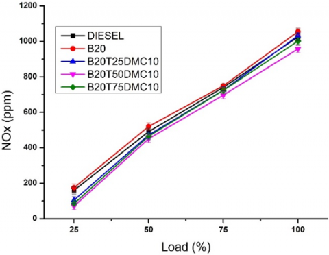NOx values at different engine loads are illustrated in Figure 11. B20 blend possesses the highest NOx emissions than diesel and other blends due to the combustion temperature, accessibility of oxygen in the combustion zone. NOx emissions can be minimized with the addition of nanoparticles which improves catalytic action and the ability of nano additives to carry away the nitric oxide [31, 34]. Maximum reduction in NOx is observed as 6.53% at full load for B20T50DMC10 than B20 blend.