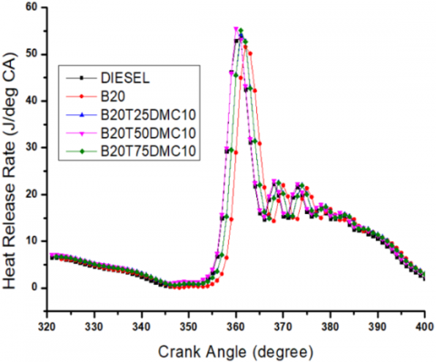 ●The net heat release rate is improved to be 10.6% for the B20T50DMC10 blend compared to B20 blend which is due to the improvement in physiochemical properties, catalytic effect, thermal properties, and ignition properties with the combined effect of nano additives and oxygenated additives.
