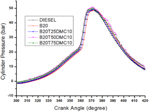 ●Peak pressure and cylinder pressure were observed to be improved for the B20T50DMC10 blend by 4.36% when compared to the B20 blend, which is attributed to improved ignition properties, higher calorific value, thermal conductivity, and heat transfer rate of nano additives when compared to the B20 blend.